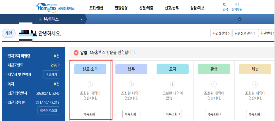 종합소득세 환급금 조회